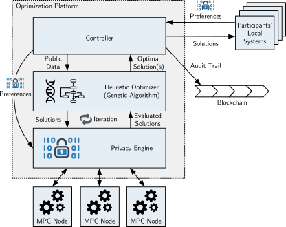 In the SlotMachine project, we developed a data sharing platform and marketplace for airlines to be able to optimize flight sequences in case of reduced capacity in the air traffic network. Airlines submit data about their preferences regarding the optimization, which allows to find a globally optimal solution to the flight prioritization problem. Airlines are compensated for giving up favourable slots, receiving credits that can be spent to prioritize flights in the future. The SlotMachine system employs evolutionary algorithms in connection with privacy-preserving computation to protect the airlines' private inputs while still allowing for optimization. The proposed distributed architecture for privacy-preserving optimization, although originally developed for the SlotMachine project, could also be potentially applied in other domains.